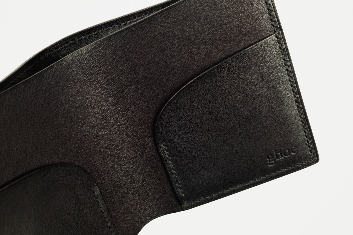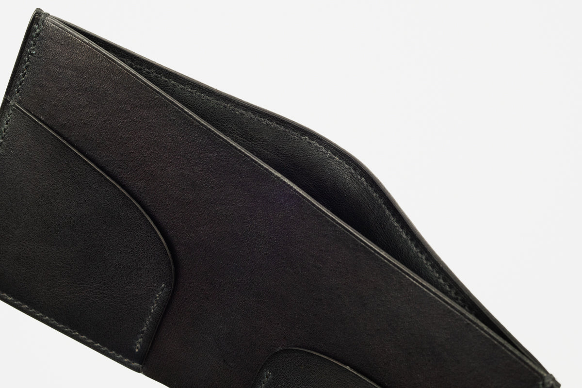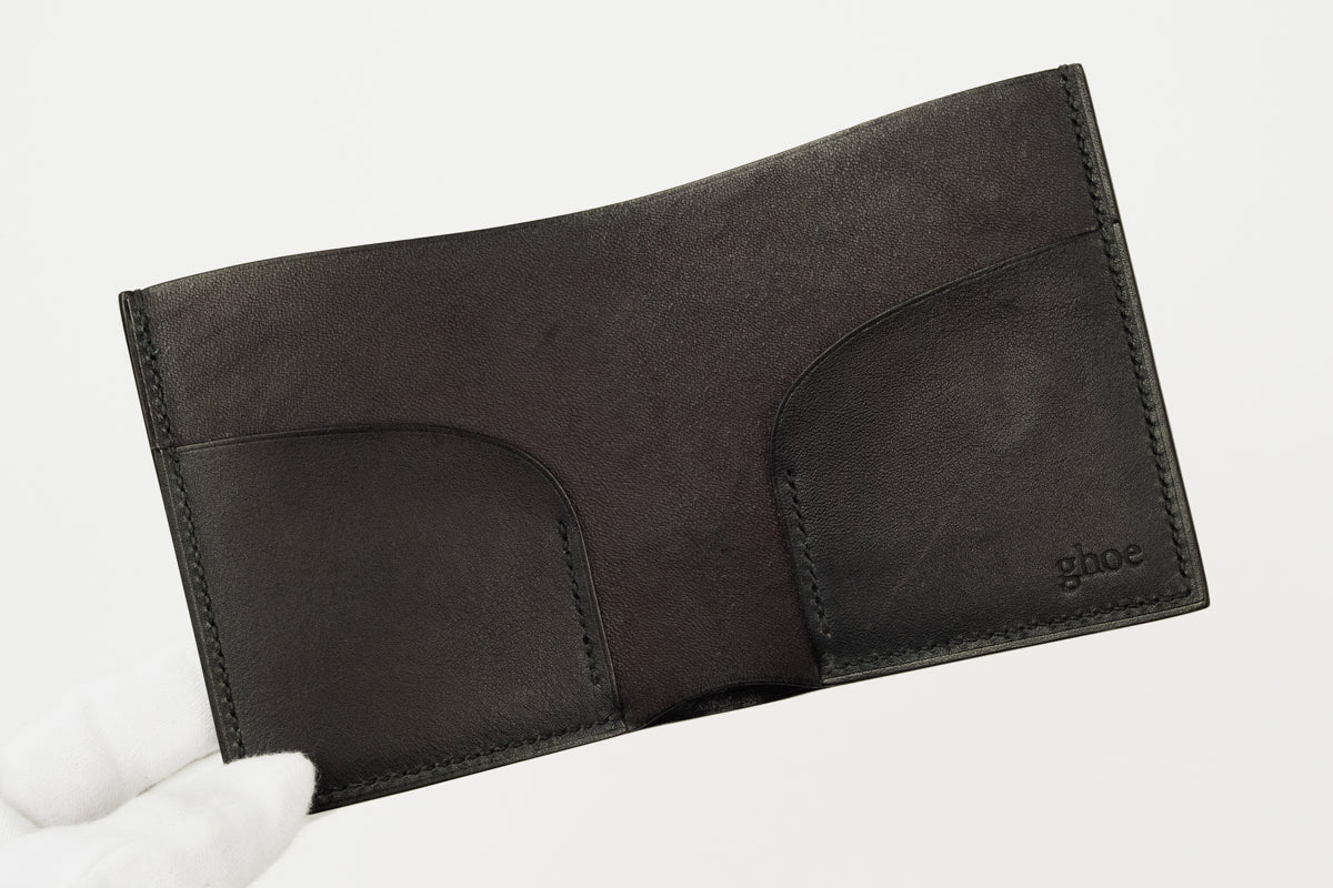 二折の札入れ。凛とした表情の正方形。両サイドにカードを挟める仕様です。