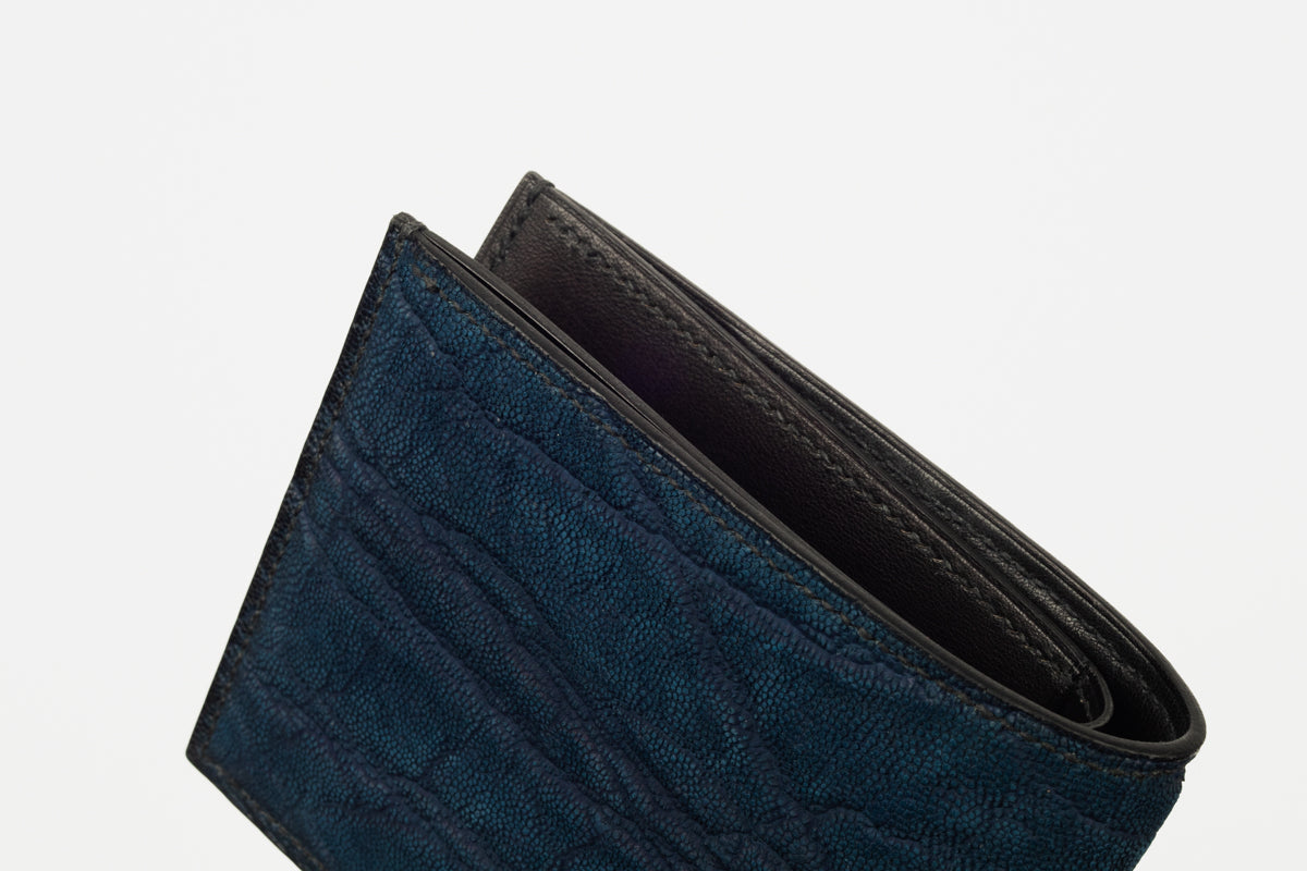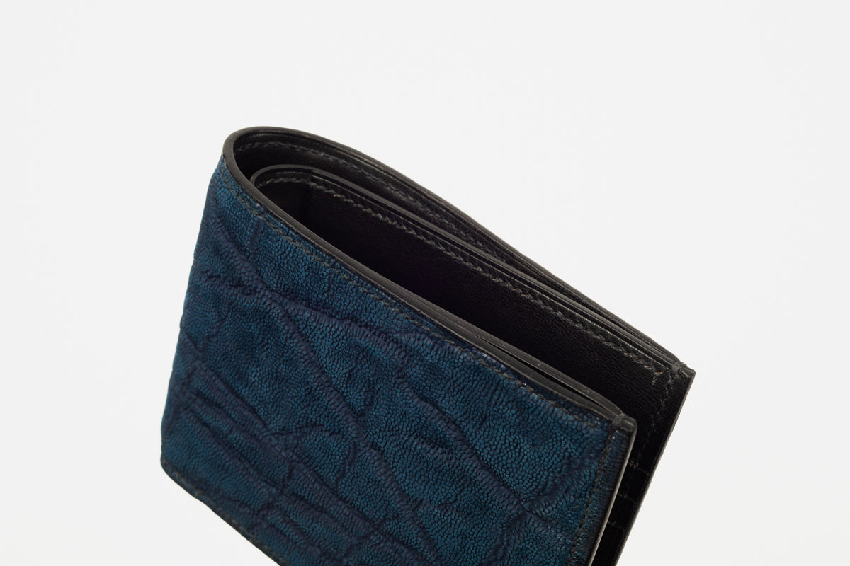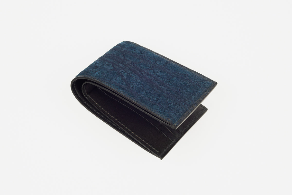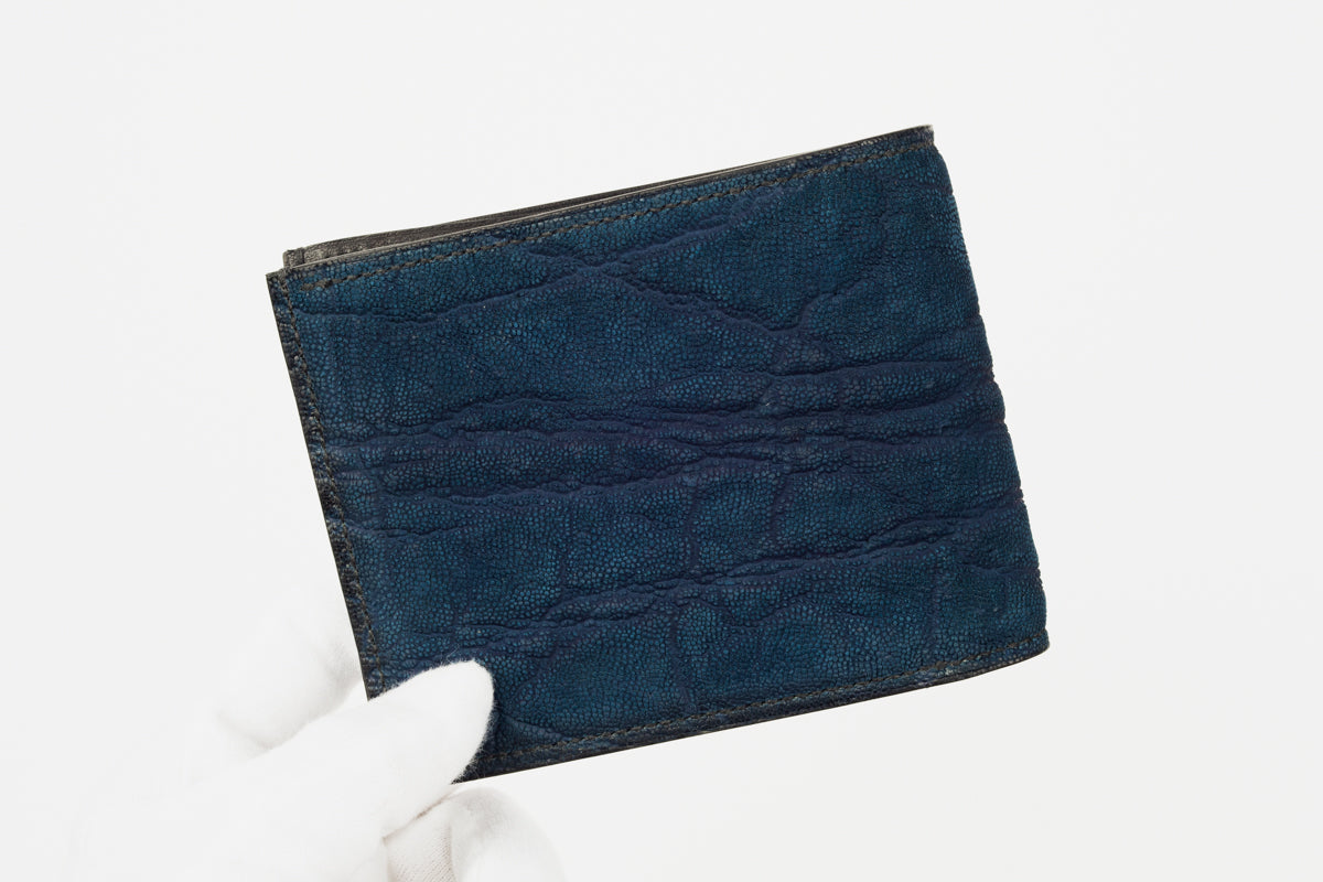 本藍染エレファント と indaco を素材に、手縫い・切目本磨きで仕立てております。