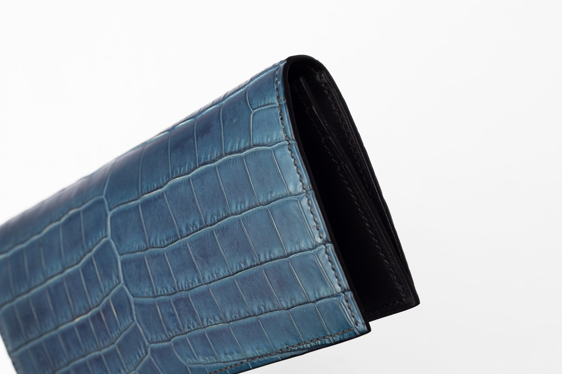 最高級のナイルクロコダイルを「天然灰汁発酵建て本藍染」で染め上げ、独自レシピで後処理。