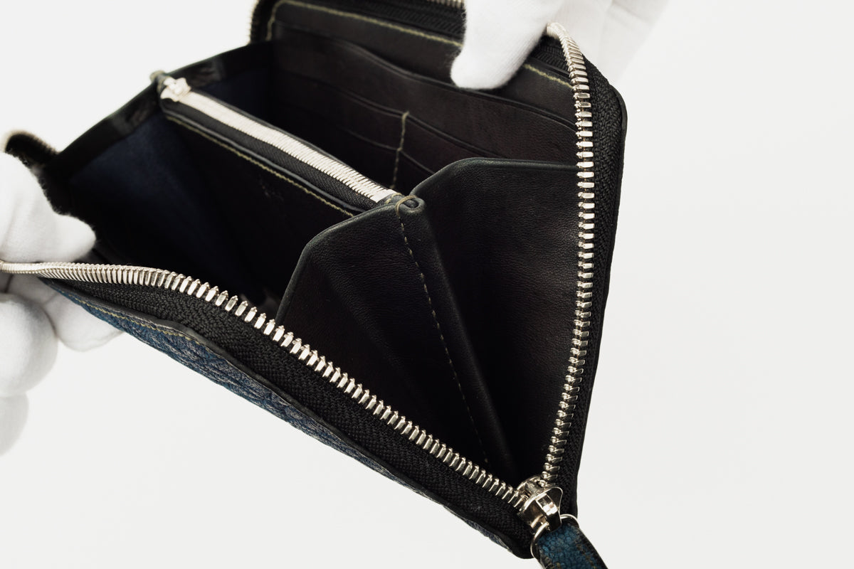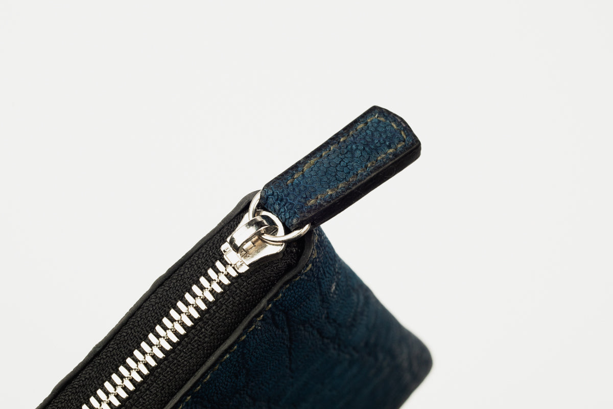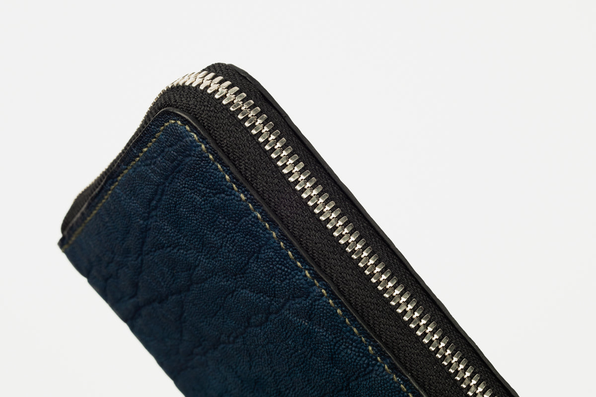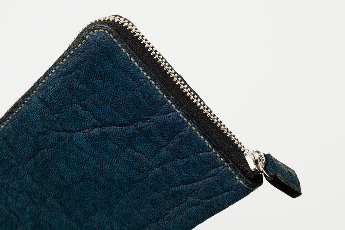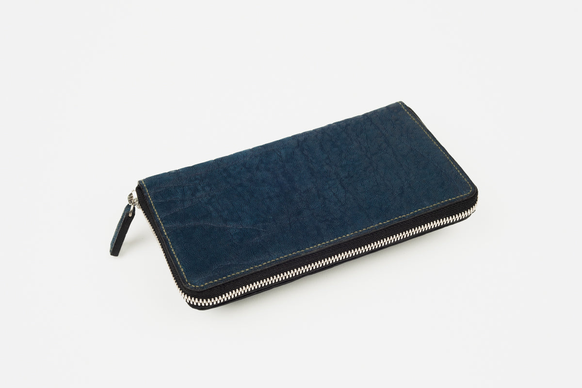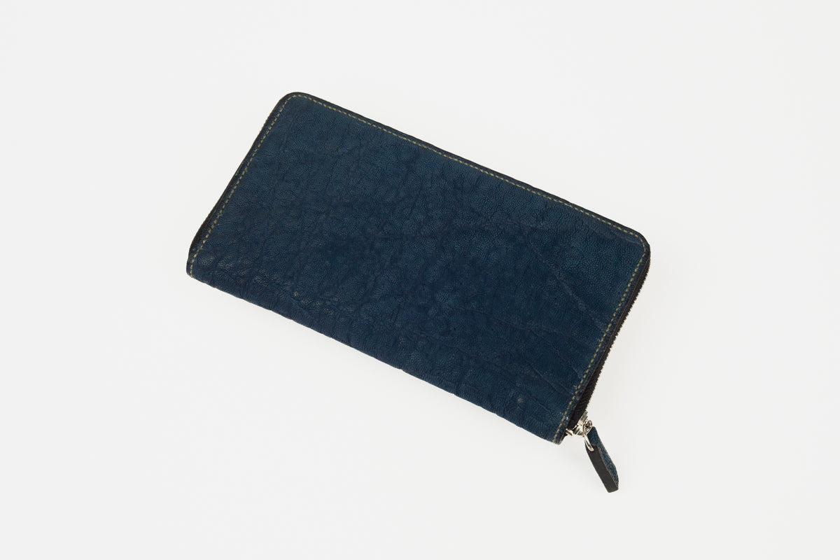 本藍染エレファント と indaco を素材に、手縫い・切目本磨きで仕立てております。